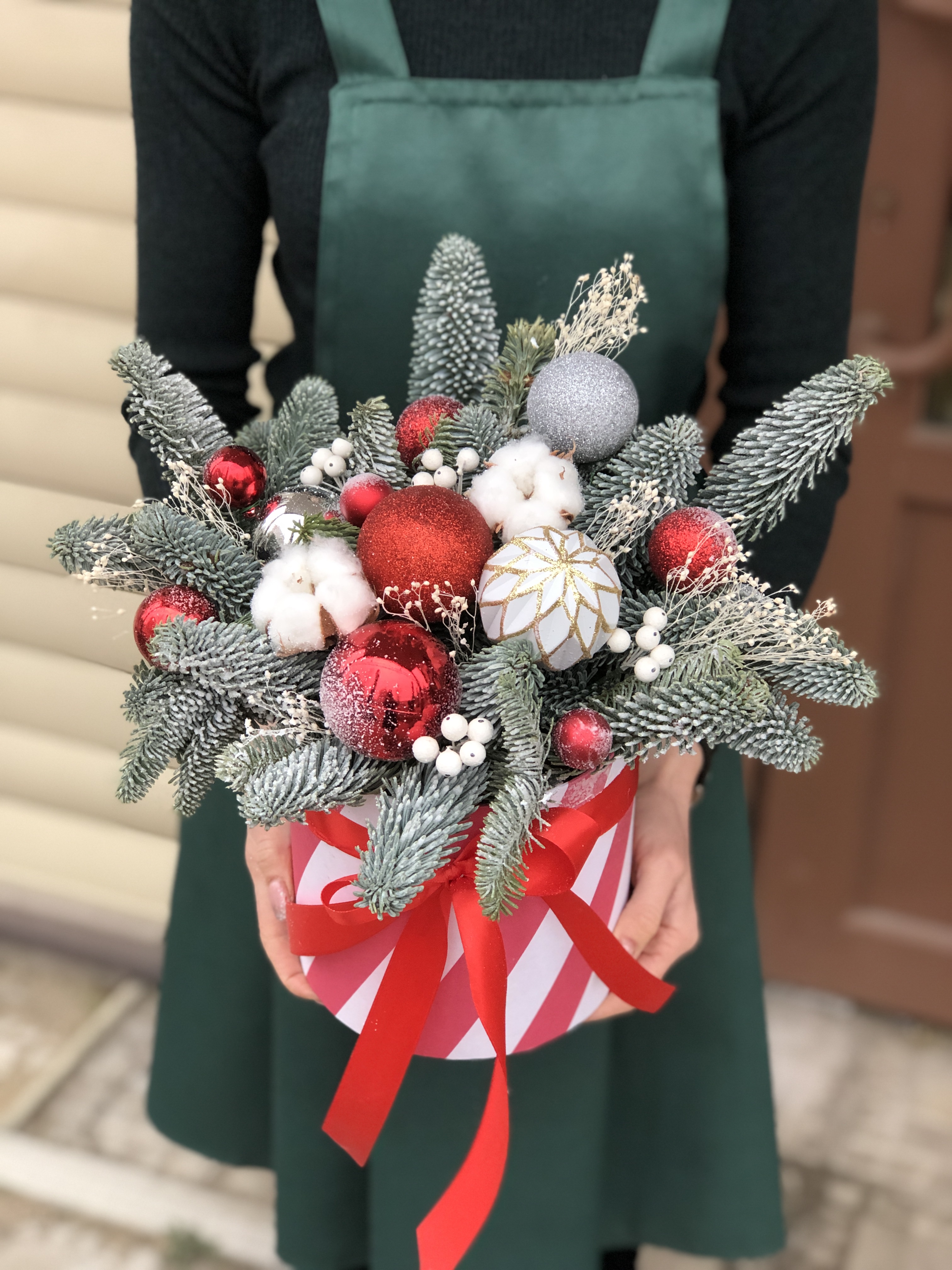 Шляпная коробка с живой хвоей Нобилиса и декором!